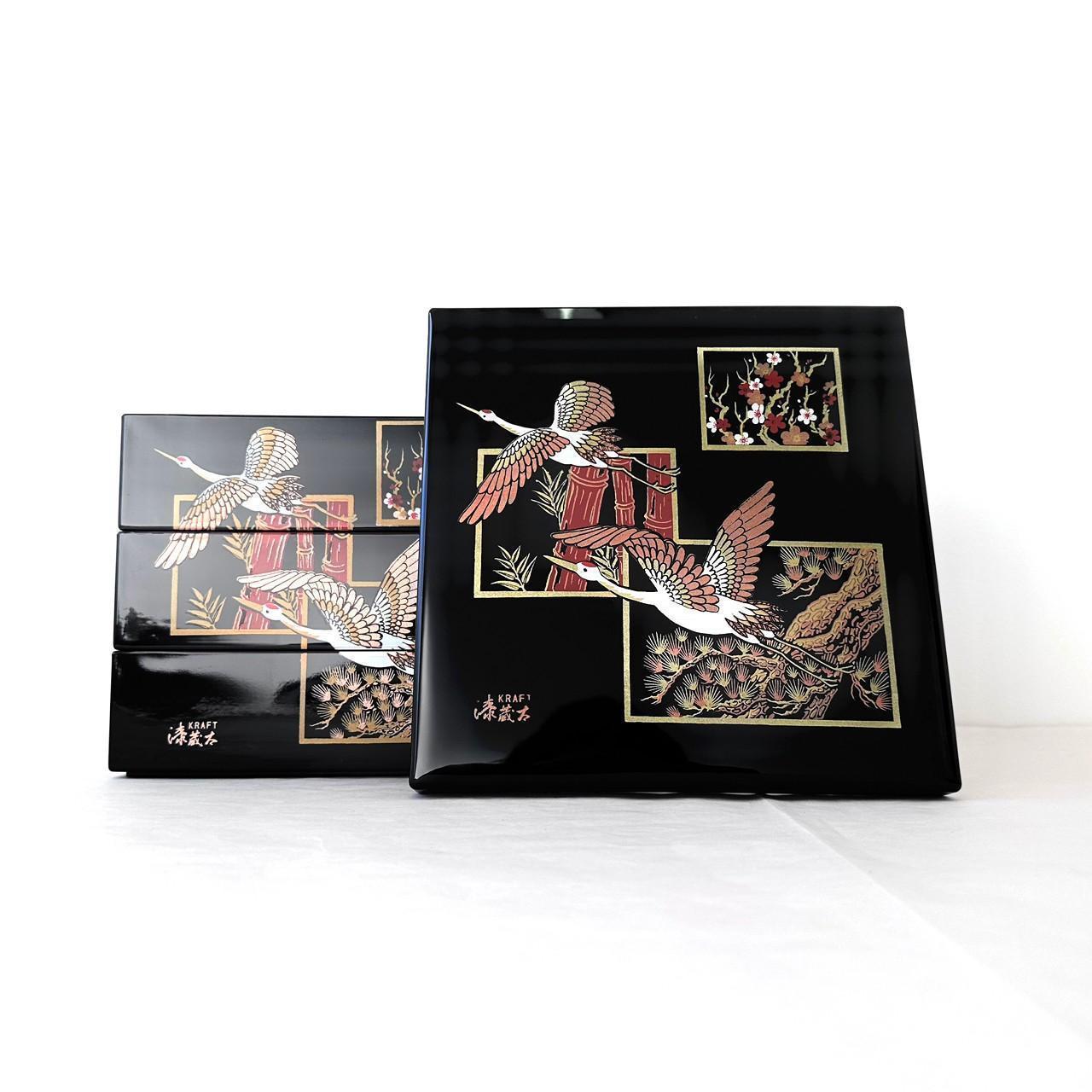 紀州漆器職人が丁寧に仕上げた 三段重箱 黒内朱 吉兆鶴 です。