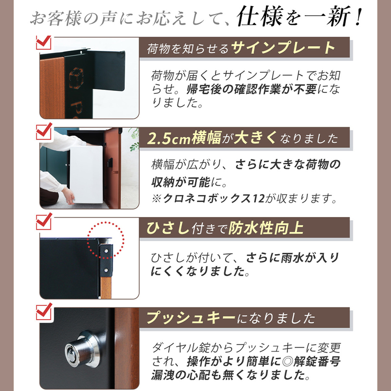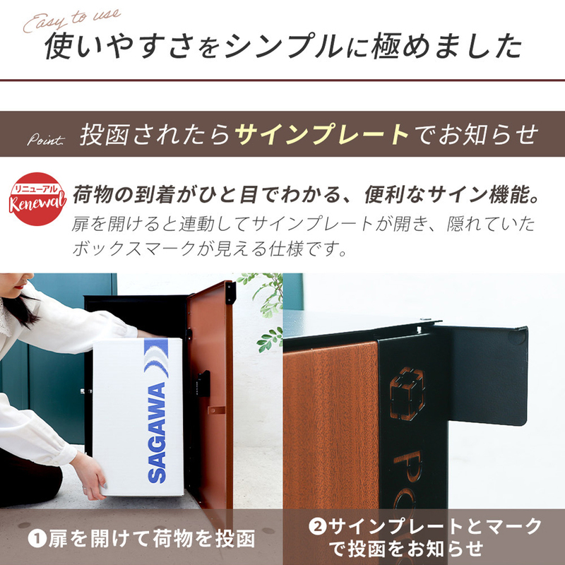 扉を閉めてもサインプレートは開いたままの為、不在中の配達も一目で確認できます。