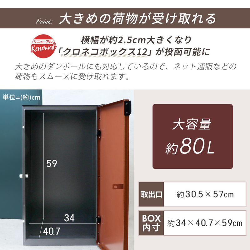 ※宅配ボックスおよびボックス内の宅配物の盗難や品質劣化につきましては、一切の責任を負いかねます。予めご了承ください。