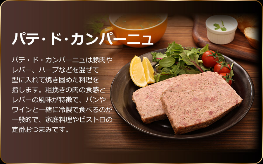 パテ・ド・カンパーニュは豚肉やレバー、ハーブなどを混ぜて型に入れて焼き固めた料理を指します。