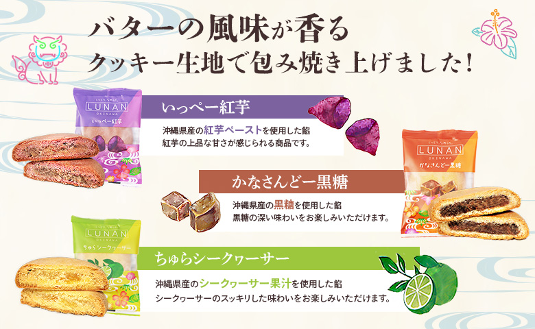 「いっぺー紅芋」、「かなさんどー黒糖」、「ちゅらシークヮーサー」3種類の味をお楽しみいただけます。