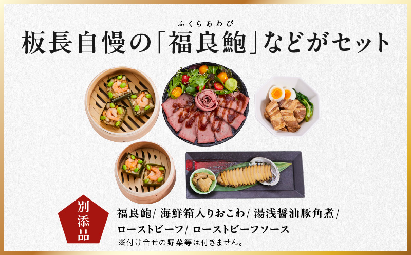 福良鮑 1個、海鮮箱入りおこわ 5個、湯浅醤油豚角煮 200g、ローストビーフ 100g、ローストビーフソース 1個