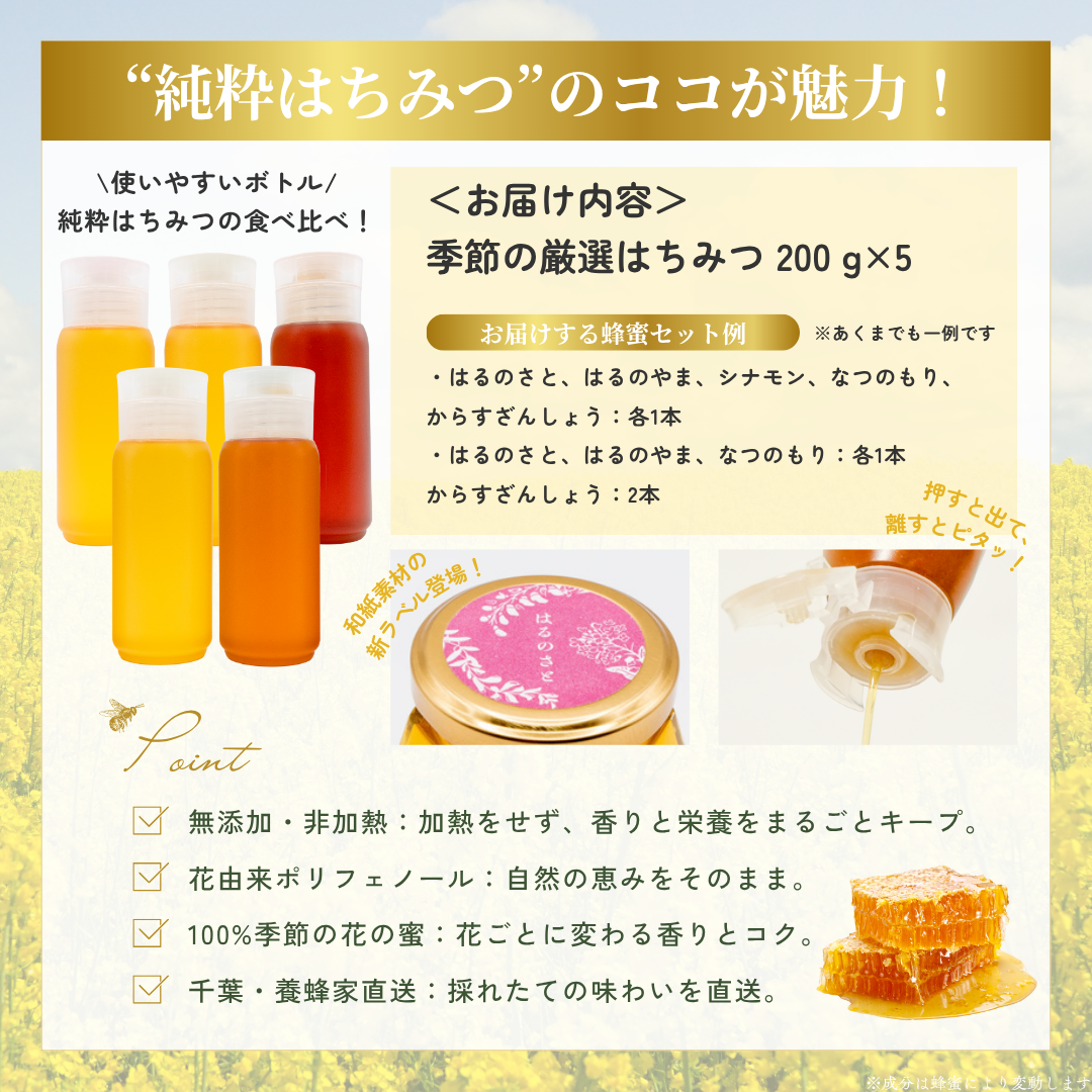 セット内容は、季節ごとに異なるはちみつの中から5本をランダムにセレクトしてお届けします。