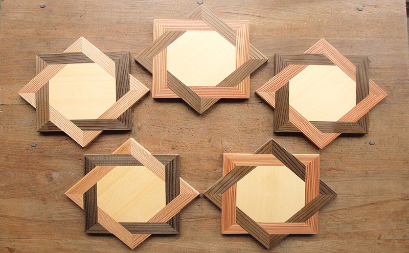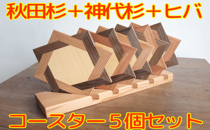 秋田杉+神代杉+ヒバによるコースター5個セット 置台付