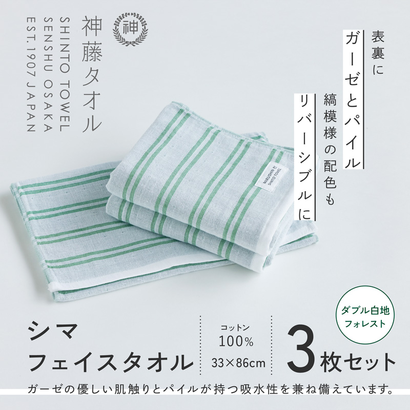 フェイスタオル 3枚、カラー:ダブル白地/フォレスト
