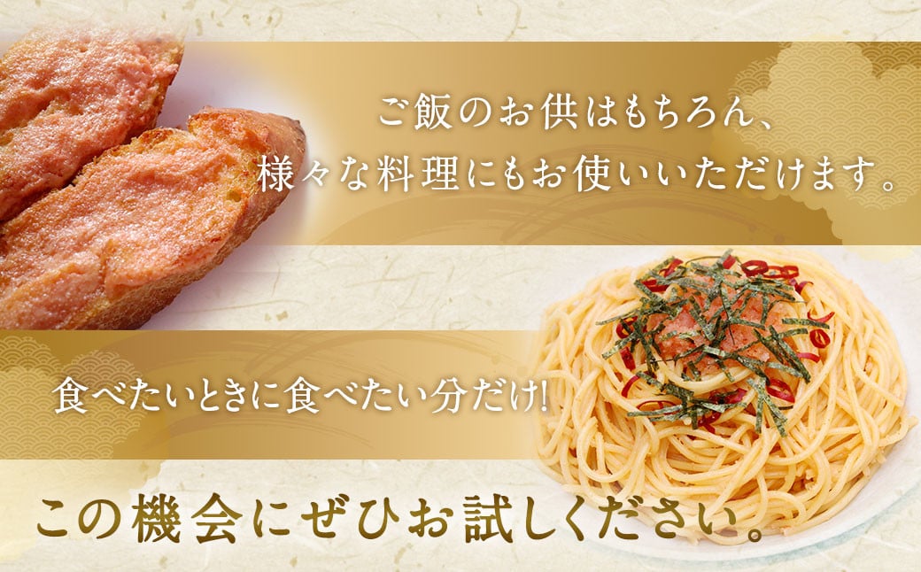 冷凍でお届けするので、食べたいときに食べたい分だけ解凍してお召しあがりいただける便利な明太子です。