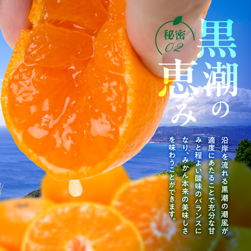 美味しさのヒミツは、この段々畑、水はけの良い岩盤質の山を切り拓いて作った園地、全ての園地が海岸線からわずか3キロ圏内。温暖な気候と適度な潮風。最もみかんの栽培に適していると言われる秩父古生層の土壌、海岸線に近いエリアにも拘らず、標高100mを超える山並に段々畑が切り拓かれています。