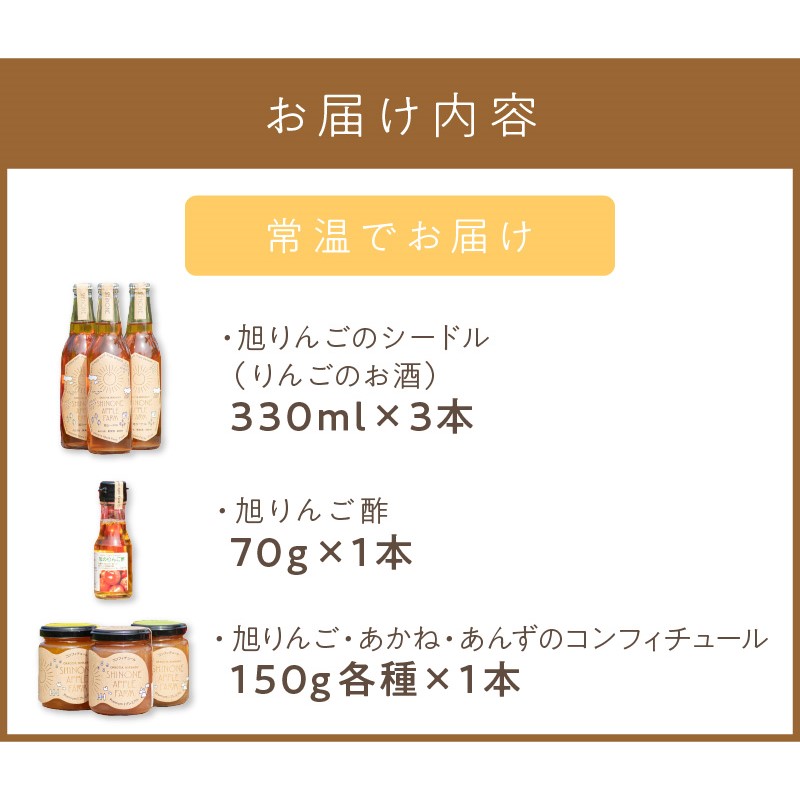 コンフィチュール3種と、時間をかけてゆっくり静置発酵法により醸造したりんご酢・希少りんご「旭」100%で作られたシードルのセットです!