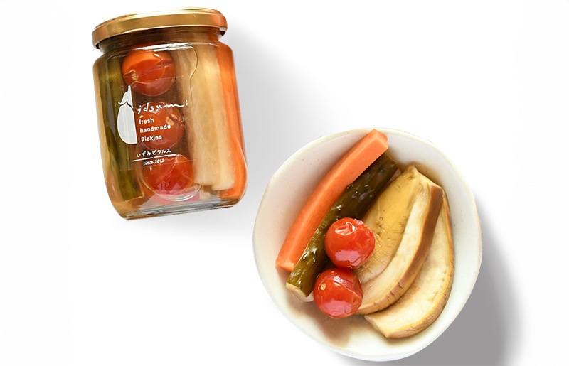 大阪泉州地域特産のフルーティで柔らかい水なすのピクルス。和風、洋風の2種類の風味をお届けします。