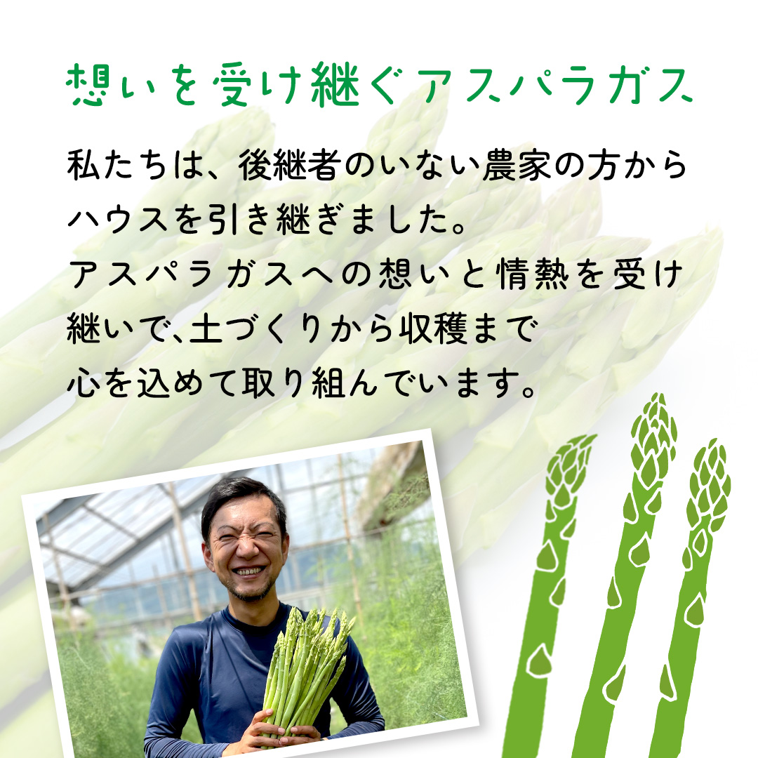 私たちがアスパラガスを育てるハウスは、後継者がいらっしゃらず、大切に育ててこられた方から引き継いだものです。その方が丹精込めて築き上げてきた畑と、アスパラガスへの情熱を受け継ぎ、妻と二人で、土づくりから日々の管理、そして収穫まで、一つひとつ心を込めて行っております。
