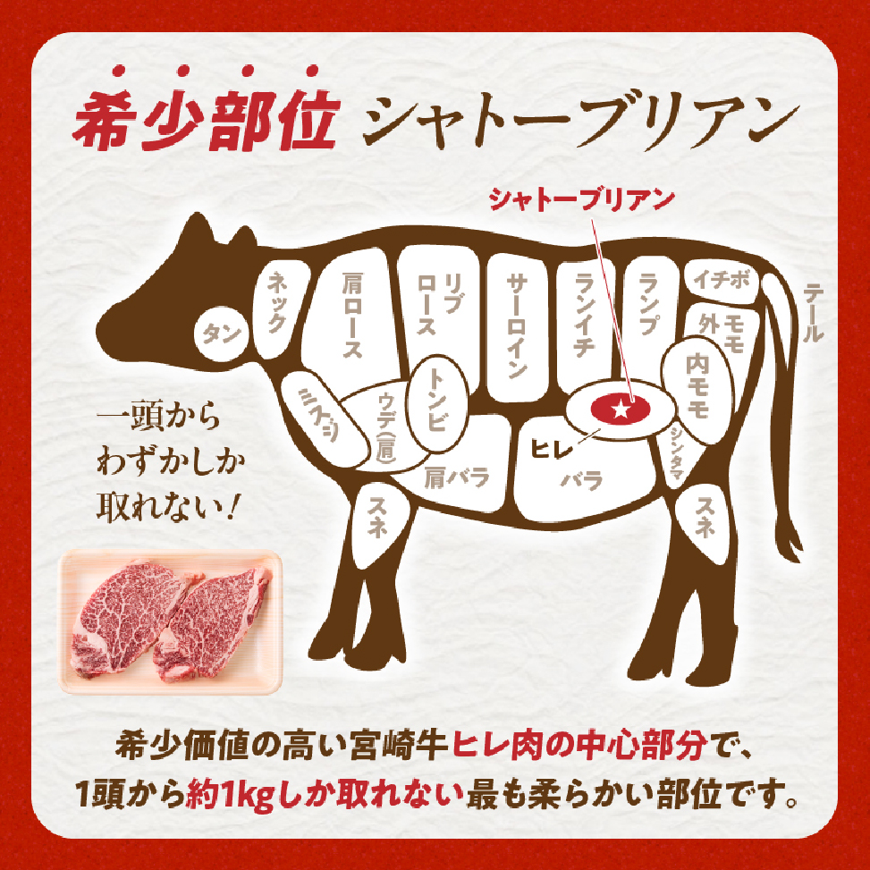 一頭からわずかしか取れない最高級のシャトーブリアンをご家族、ご友人とご堪能ください。