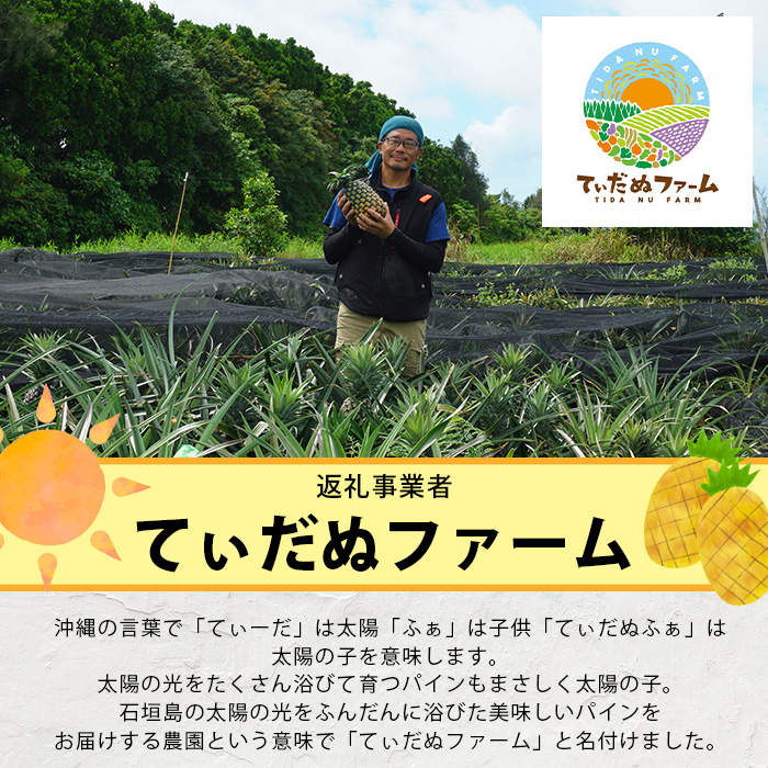 太陽の光をたくさん浴びて育つパインもまさしく太陽の子。石垣島の太陽の光をふんだんに浴びた美味しいパインをお届けする農園という意味で「てぃだぬファーム」と名付けました。