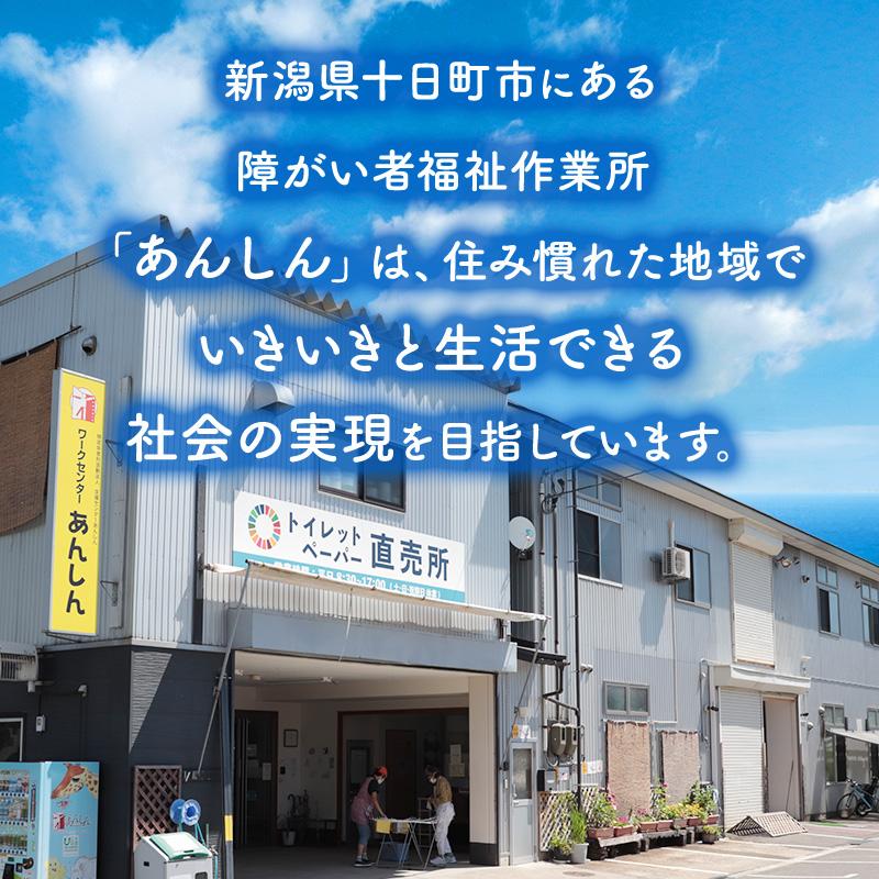 障がい者福祉作業所「あんしん」の自社工場で生産加工されているダブルTP100個(50個×2箱連結)包装なしを、3カ月に1回、年間4回の計400個をお届します。TPの購入支援は障がい者雇用と障がい者が手慣れた作業を安定的に取り組む基となるもので、あんしんのTP作業を支え、お客様との絆としても重要なものです。ゴミ減量や環境保全にも貢献する雑古紙を再利用も漂白剤不使用で安心です。環境に大変優しい製品です。