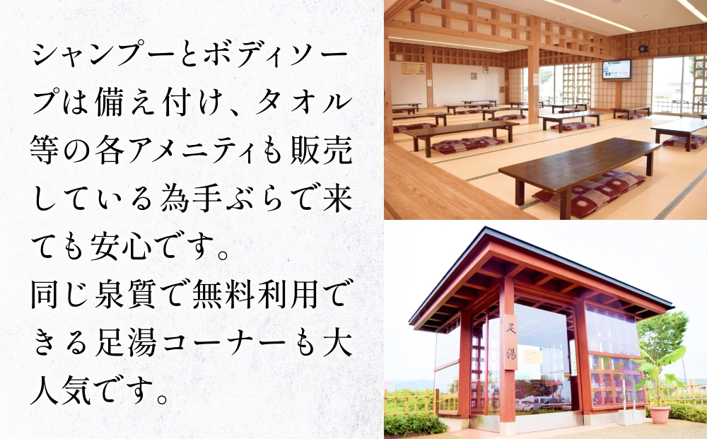 シャンプーとボディソープは備え付け、タオル等の各アメニティも販売している為手ぶらで来ても安心です。同じ泉質で無料利用できる足湯コーナーも大人気です。