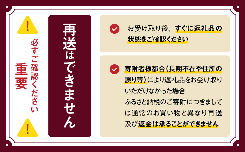 ふるさと納税のご寄附につきましては通常のお買い物と異なり再送および返金は承ることができません。何卒ご理解賜りますようお願い申し上げます。