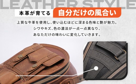 厳選された牛革を使用し、使い込むほどに深い色合いと独特のツヤが生まれる「経年変化」を楽しめます。個体ごとのシワ、キズ、色合いの濃淡は、あなただけの唯一無二のバッグとして成長していく証です。カラーは、どんなバイクにも合わせやすい定番のブラックと、ヴィンテージ感を漂わせるブラウンの2色展開です。