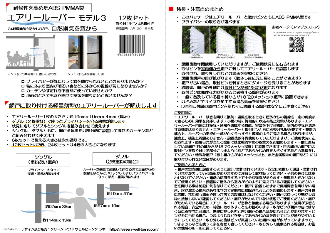 エアリールーバー モデル3(網戸に取付ける薄型軽量ABS-PMMA製耐候型ルーバー)12枚セット