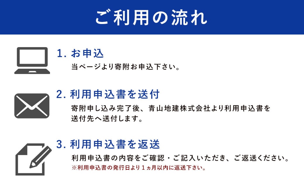 2.寄附申し込み完了後、青山地建株式会社より利用申込書を送付先へ送付します。