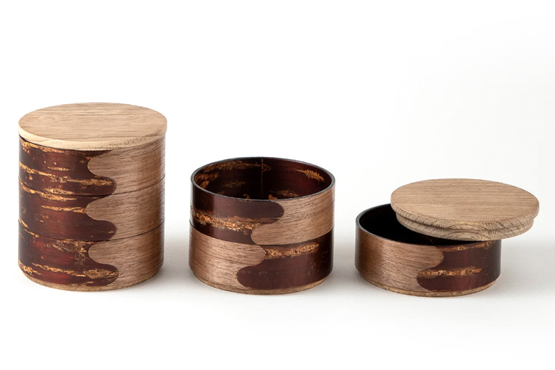 ヤマザクラ樹皮とウオールナットの突板をフィンガージョイントして筒状にしています。これまでジョイント部分のデザインは直線的なものが多かったのですが、このBUCHIシリーズでは自然の営みを感じさせる、より有機的な形状のジョイントとしました。