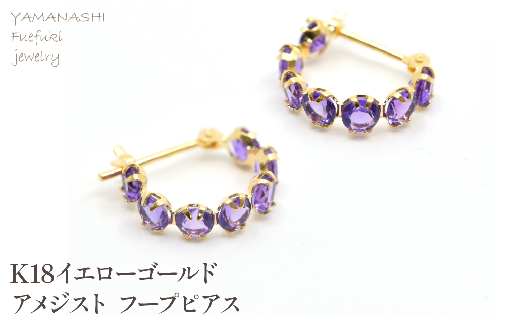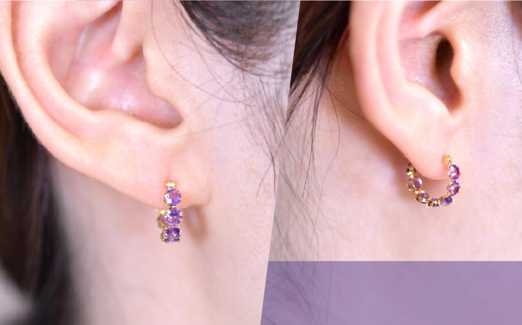上品なラベンダーカラーのアメジストは2月のバースデーストーンとして有名な宝石です。鮮やかなラベンダーカラーはアメジストの高貴という石言葉にピッタリのカラーです。身に着けるだけで上品な印象を演出できる18金のピアスは世代を越えて愛される1品です。オフィスでのクールなコーディネイトにもディナーやホテルのラウンジなどのエレガントなコーディネイトにも、オンでもオフでも活躍できるピアスは頑張った自分へのご褒美のアイテムとしてもオススメです。