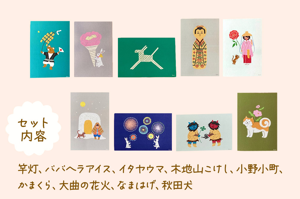 セット内容:竿灯、ババヘラアイス、イタヤウマ、木地山こけし、小野小町、かまくら、大曲の花火、なまはげ、秋田犬
