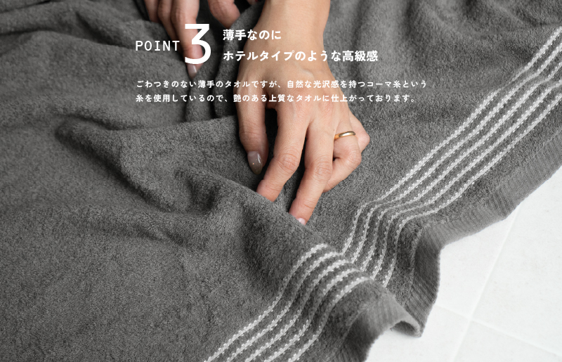 なめらかできめ細やかな、まるでシルクのような肌触りのタオルです。