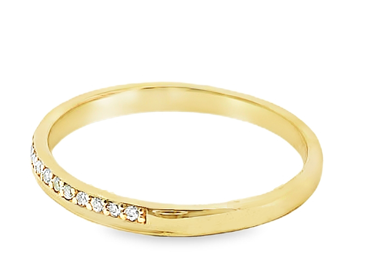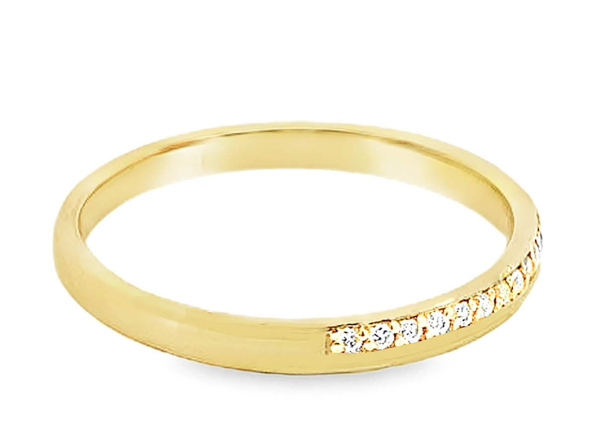 指輪の半分には、ダイヤモンドが一列に留められたハーフエタニティのデザイン、もう半分はK18金の鏡面仕上げのリングとなっています。