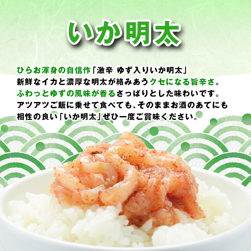 いか明太:新鮮なまついかに濃厚な明太が絡みあい、クセになる旨辛さ。後引く辛さに、ふわっとゆずの風味が香ります。