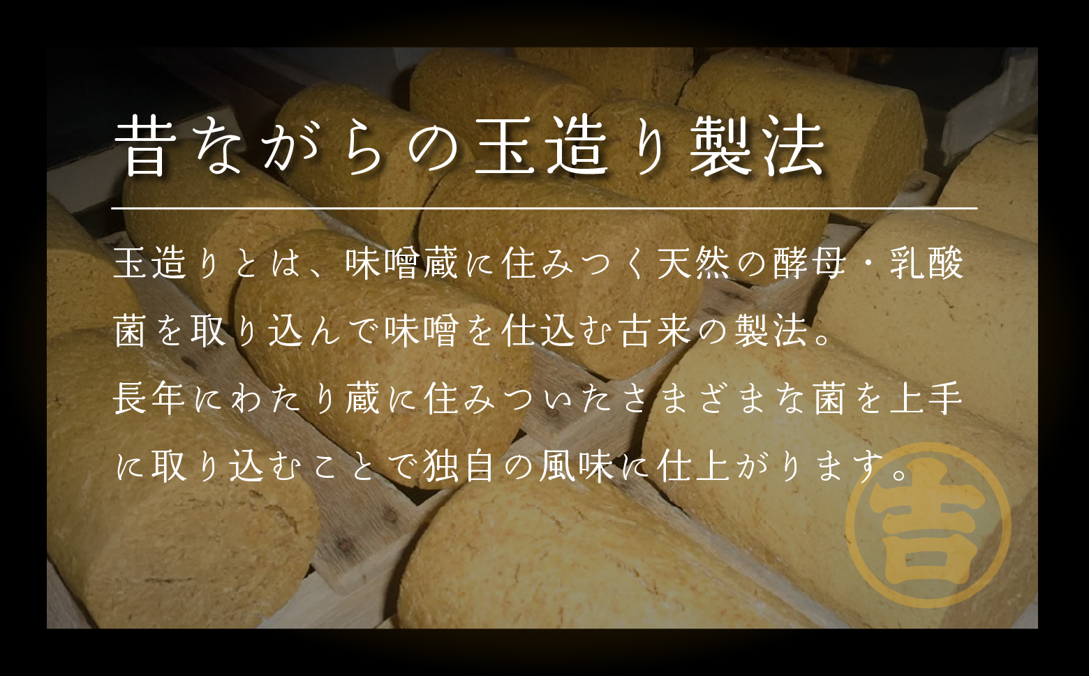 一年醸造味噌は、蔵付き菌の利用を目的とした「玉造り製法」で作られています。玉造りとは、味噌蔵に住みつく天然の酵母・乳酸菌を取り込んで味噌を仕込む古来の製法。長年にわたり蔵に住みついたさまざまな菌を上手に取り込むことで独自の風味に仕上がります。