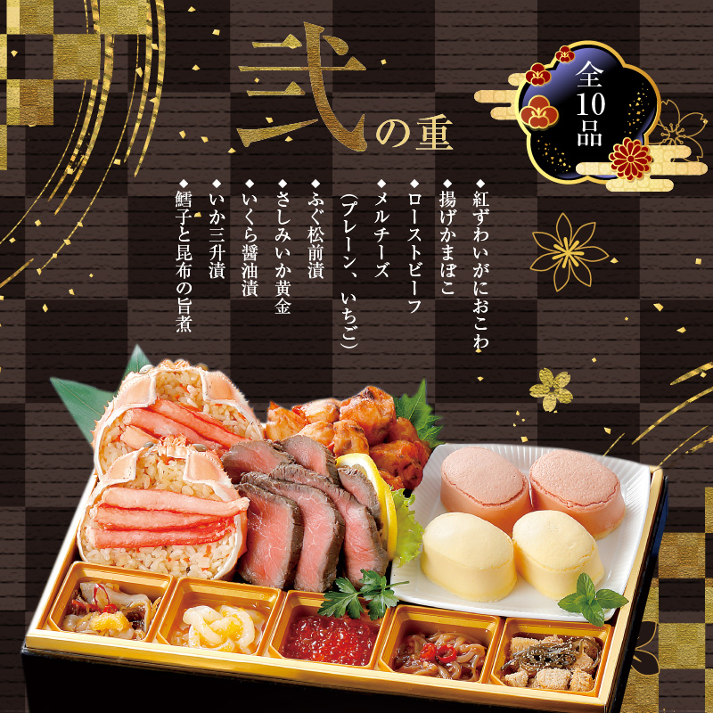 紅ずわいがにおこわ、揚げかまぼこ、ローストビーフ、メルチーズ(プレーン、いちご)、ふぐ松前漬、さしみいか黄金、いくら醤油漬、いか三升漬、鱈子と昆布の旨煮