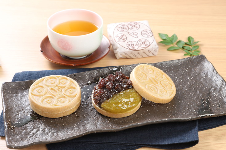 安土名物『まけずの鍔』は、桶狭間の合戦以降、連戦連勝した織田信長公愛刀の鍔をそのまま型どった、2色餡入りの縁起のいい“もなか”です。勝利を呼び込んだ信長公の鍔にあやかり、勝負事の必勝祈願や受験生の合格祈願用としても愛されている逸品です。皮は、近江特産の滋味豊かな滋賀羽二重餅を使用。1枚1枚丹念により香ばしく焼き上げています。あんこは、厳選した北海道産の大納言小豆と大手亡(インゲン豆)を豊かな安土の伏流水を使って、ふっくら、しっとりと炊き上げました。 また、『まけずの鍔』の個包装には、その由来がデザインとして記載されていますので、ご賞味の折には是非お読み下さいませ。