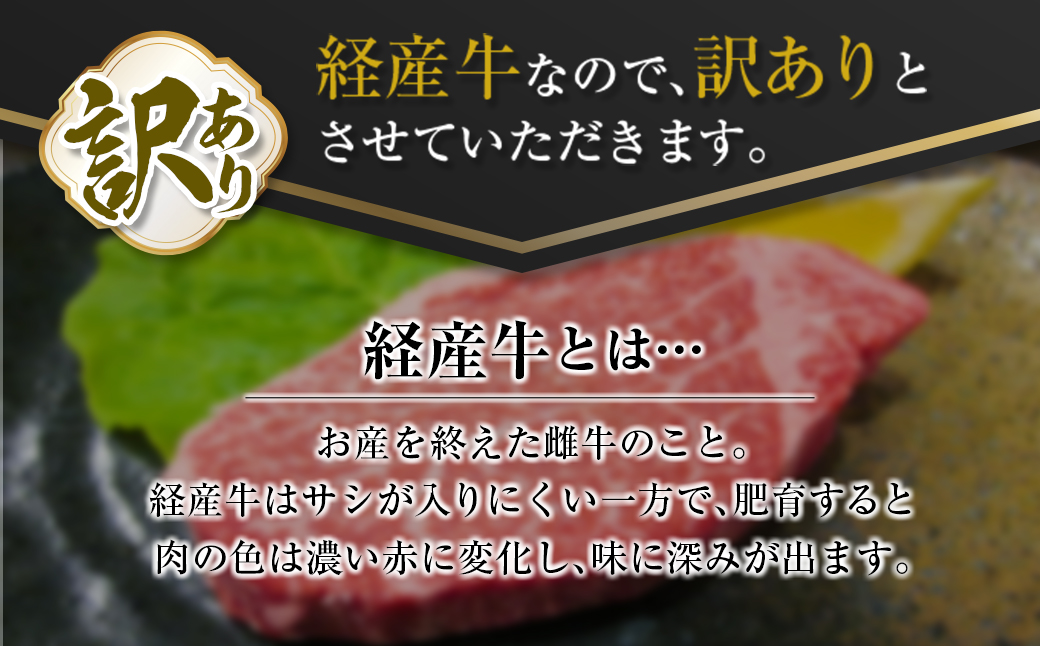 経産牛(お産を経験した雌牛)のため、肉にサシが入りにくく、肉質がやや硬いため訳ありとさせていただきます。