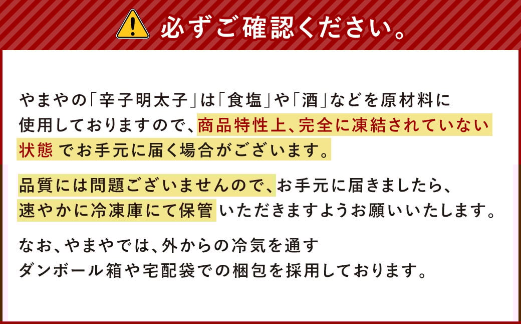 やまやの「辛子明太子」は「食塩」や「酒」などを原材料に使用しておりますので、製品特性上、完全に凍結されていない状態でお手元に届く場合がございます。