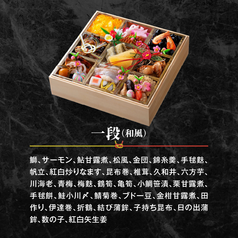 鰤、サーモン、子持ち鮎甘露煮、松風、金団、錦糸羹、手毬麩、帆立、紅白炒りなます、昆布巻、椎茸、久和井、六方芋、川海老、青梅、梅麩、鶴筍、亀筍、丁呂木、小鯛笹漬、栗甘露煮、手毬餅、鮭小川〆、鯖菊巻、ブドー豆、金柑甘露煮、田作り、伊達巻、折鶴、結び蒲鉾、子持ち昆布、日の出蒲鉾、数の子