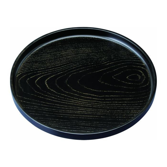 紀州漆器職人が丁寧に仕上げた【丸盆 30cm 金彩 黒ケヤキ杢 ノンスリップ】です。