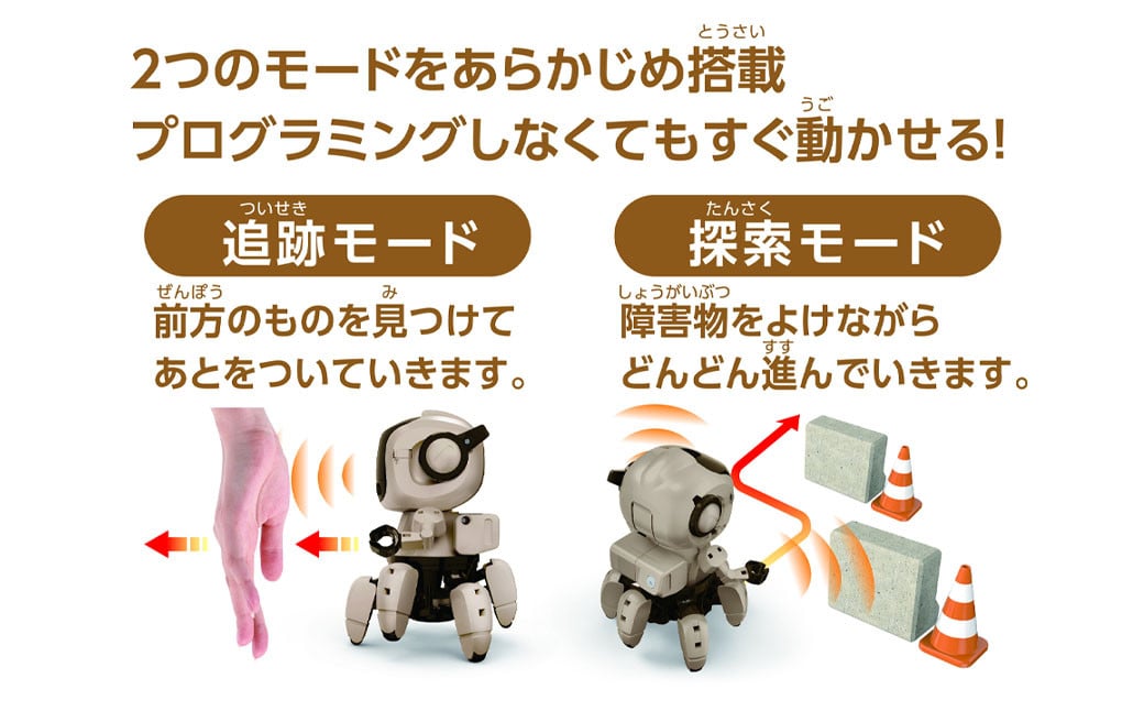 赤外線センサーにより障害物回避、物体追跡、さらにスピーチ・シンセサイザ搭載で音声によるメッセージングなど多彩なロボットプログラミングが体験できます。