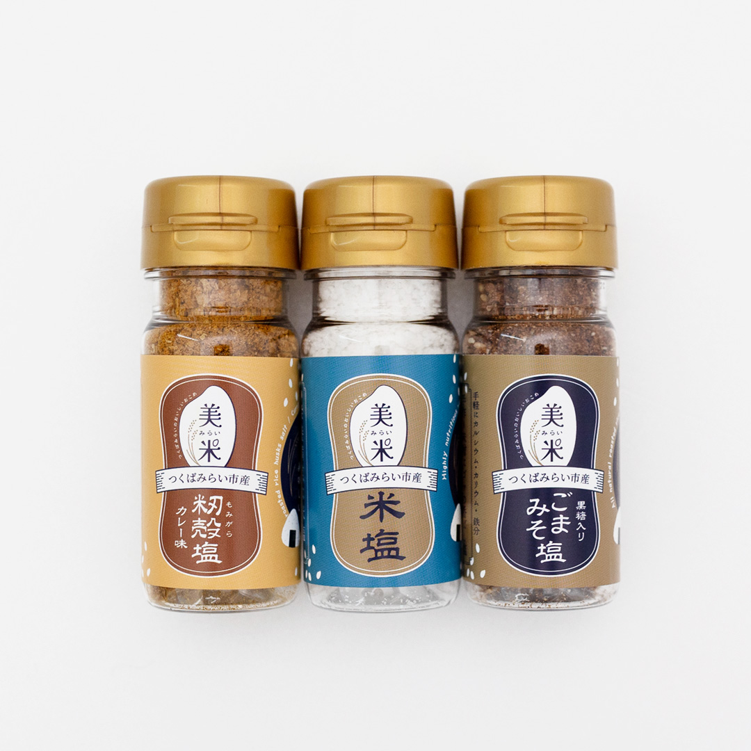 金の恵み米塩 美米~みらい~ 塩3種セット(米塩・籾殻塩カレー味・黒糖入りごまみそ塩) ソルト しお salt 食べ比べ 調味料 塩 セット 便利 料理 味付 アレンジ こだわり 天然 ミネラル 手づくり さかたの塩 おにぎり 米 コシヒカリ こしひかり 玄米 甘み 旨味[AI29-NT]-[AI29-NT]