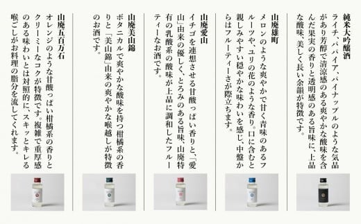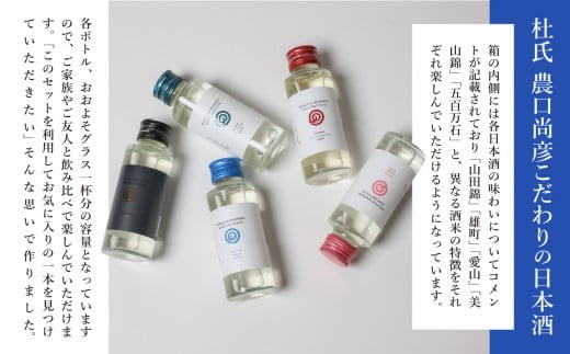 - ■純米大吟醸酒100ml 1本 ■山廃雄町100ml 1本 ■山廃愛山100ml 1本 ■山廃美山錦100ml 1本 ■山廃五百万石100ml 1本(計5本 100mlミニボトル×5本)