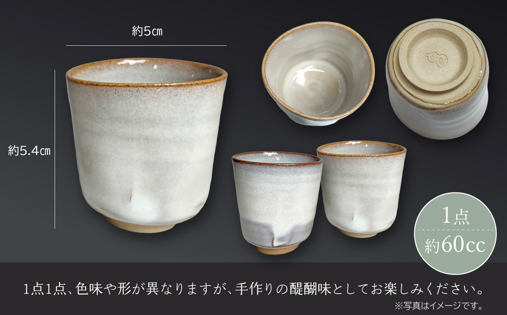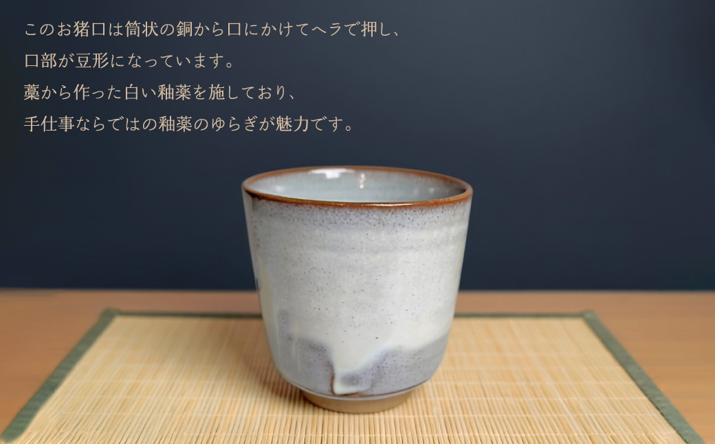 このお猪口は筒状の銅から口にかけてヘラで押し、口部が豆形になっています。藁から作った白い釉薬を施しています。