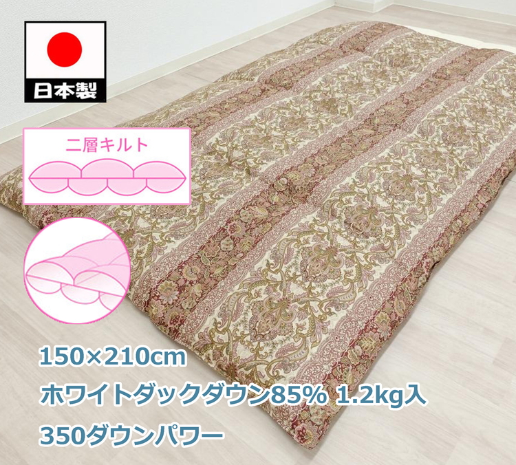 高熱で攪拌する「パワーアップ加工」と除塵しながらの「オゾン加工」を施した350ダウンパワー以上の良質なホワイトダックダウン85%が1.2kgも入れてあり、とてもふわふわで暖かいです。