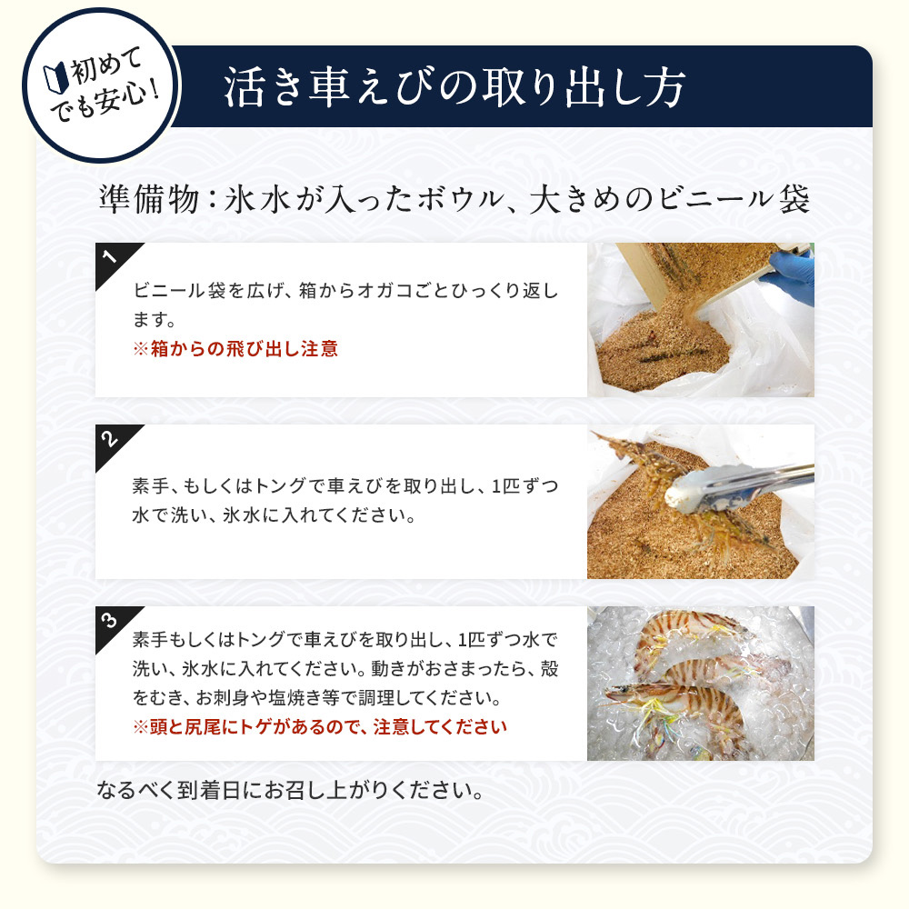 お刺身用としても最適な、活きたままの車えびを、おがくずに入れてお届けします!
