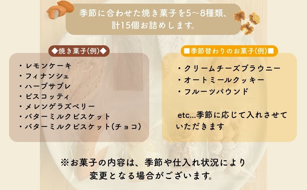内容は「おまかせ」となり、季節に合わせた焼き菓子を5~8種類、計15個お詰めします。