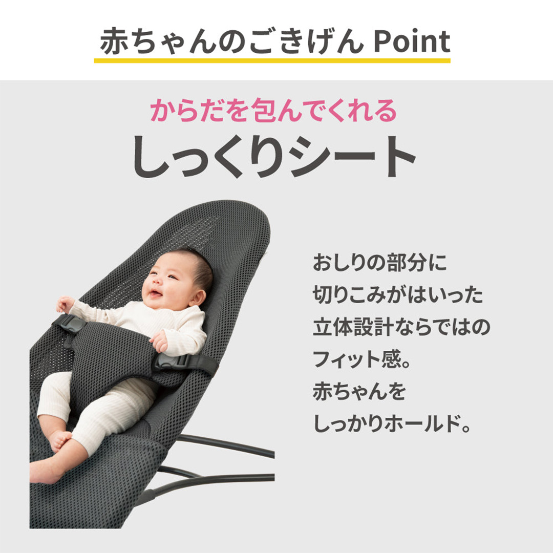 赤ちゃんの座るシート全面に3Dメッシュを使用。素材が3層構造になっているので、汗などの湿気が蒸発しやすい。空気の層をふくんでいるので、乗りごこちふんわり。
