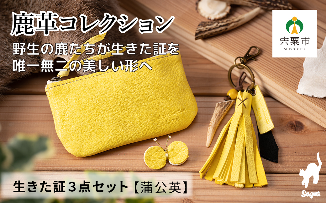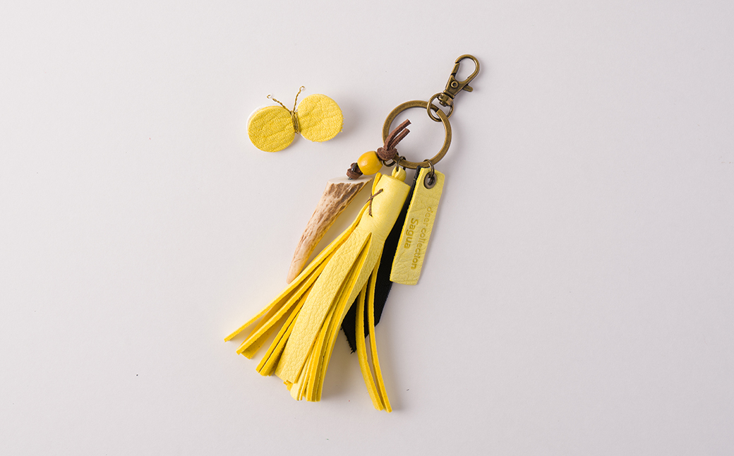 こちらのお品は鹿革を使用した「神の使いジッパーモデル」「幸運の角タッセルチャーム」「里山を舞うちょうちょブローチ」の三点セットとなっております。