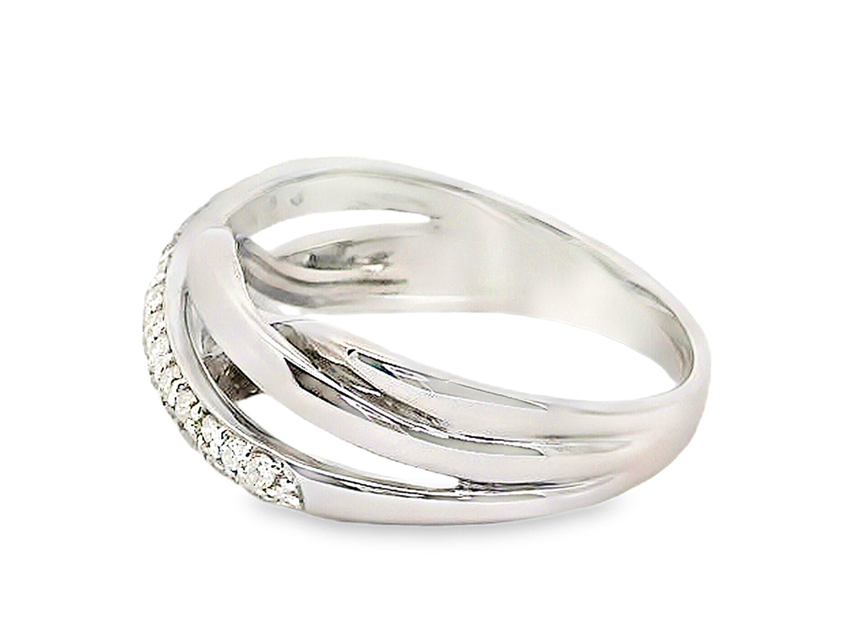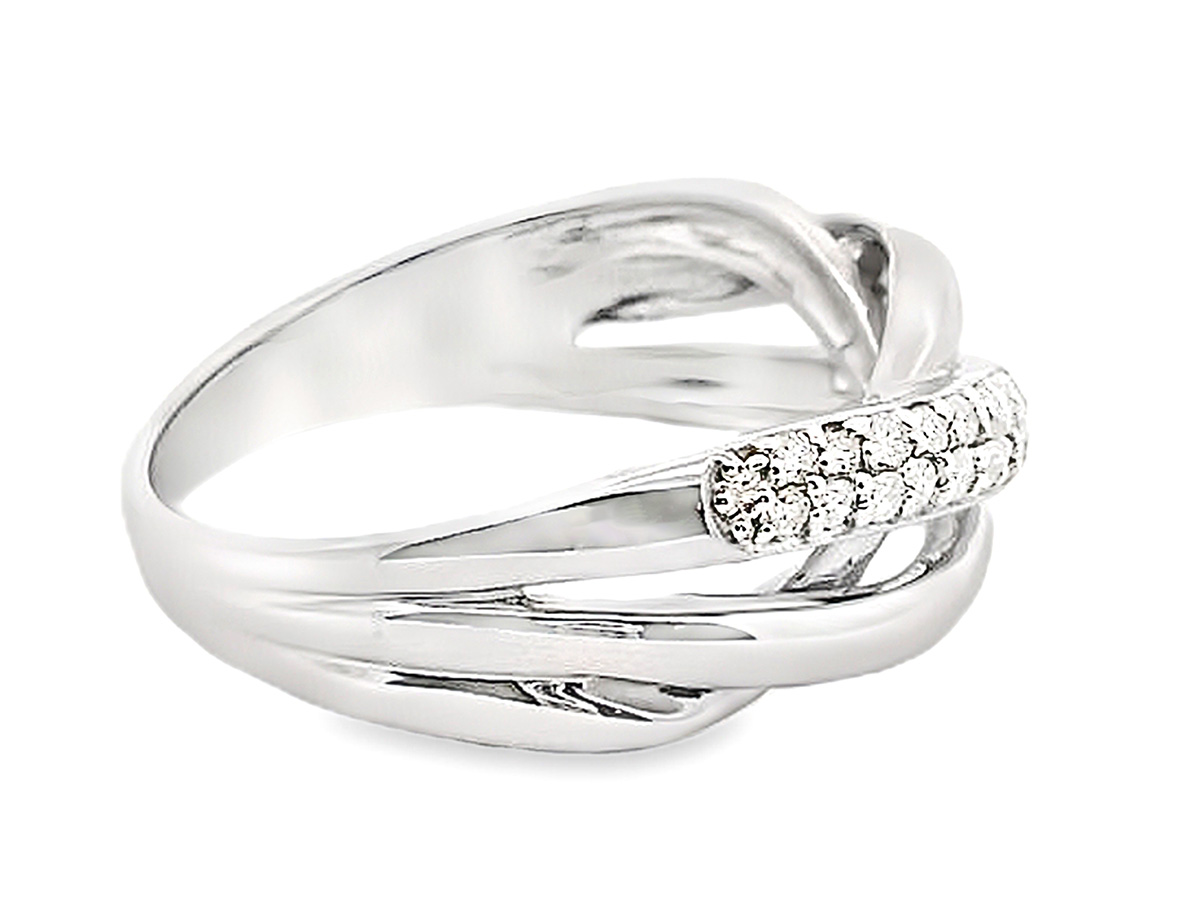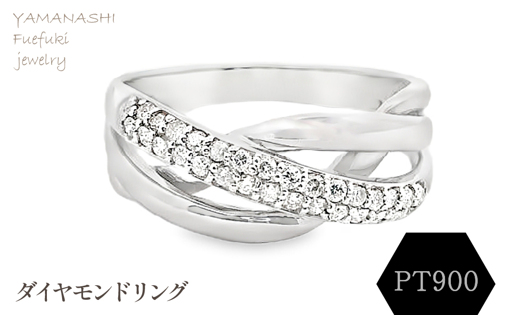 ダイヤモンドを30石使用し、美しい煌めきを演出したプラチナのリングです。鏡面仕上げのプラチナ地金が、ダイヤモンドの下に編み込まれるように左右から伸びる、立体感のある編み込み風デザインが特徴です。