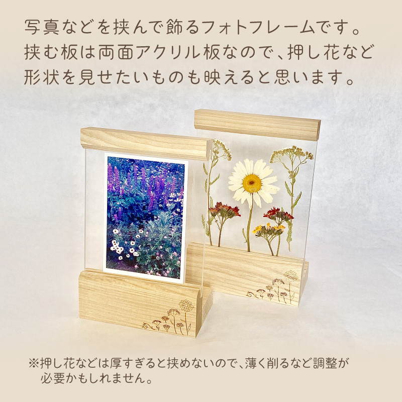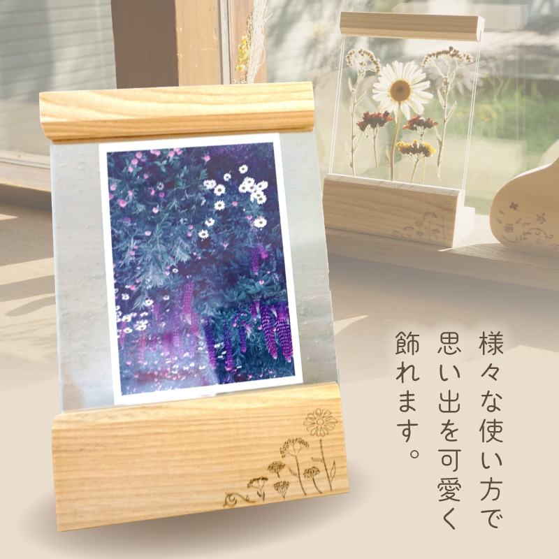 挟む板は両面アクリル板なので、押し花など形状を見せたいものも映えると思います。