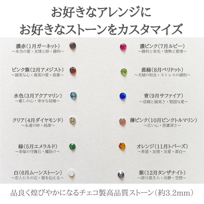 ピンク、グリーン、イエローグリーン、水色、レッド、ホワイト、イエロー、ブルー、パープル、オレンジの選べる10色。ストーンは12色ご用意。