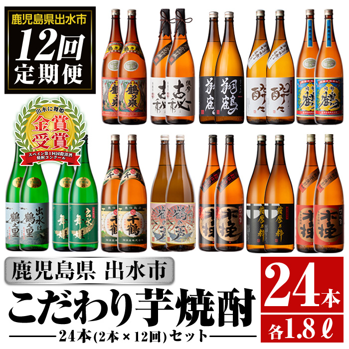 鹿児島県出水市にある3つの焼酎蔵 出水酒造・雲海酒造・神酒造 が造る芋焼酎を1800mlボトルで24本(12種類)を毎月2本ずつ全12回に分けてお届けする定期便になります。
