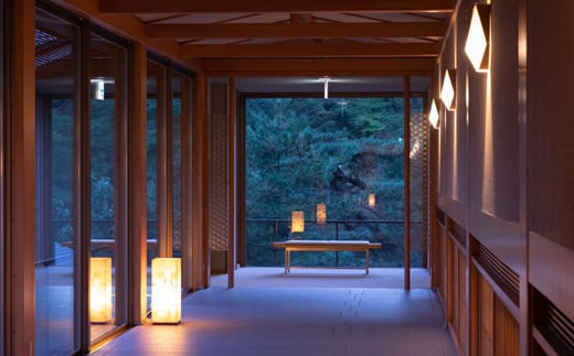 かがり火が焚かれる白砂の中庭を取り囲む形で、自然との調和を重んじる新数奇屋造りの客室が並んでいます。