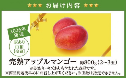 【2026年発送】<訳あり・ご家庭用>完熟アップルマンゴー約800g(白箱)2玉~3玉